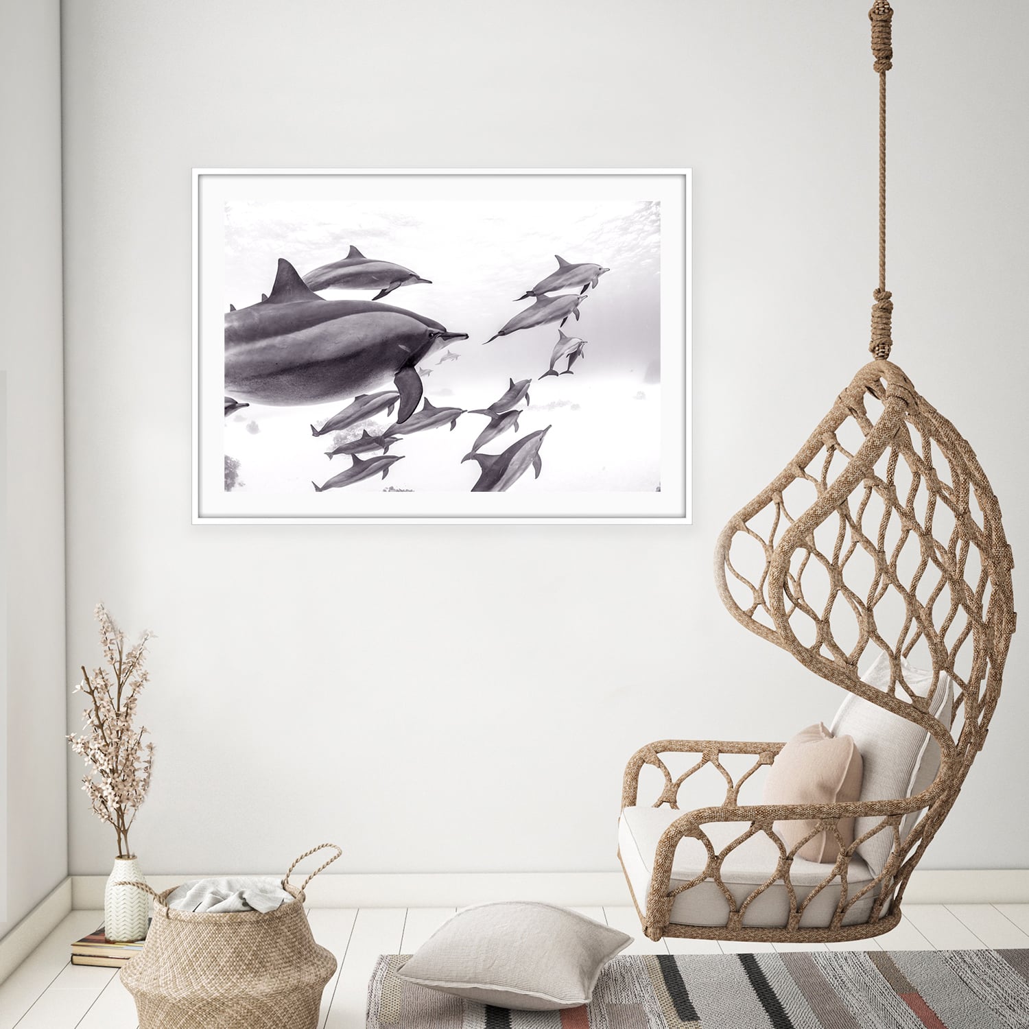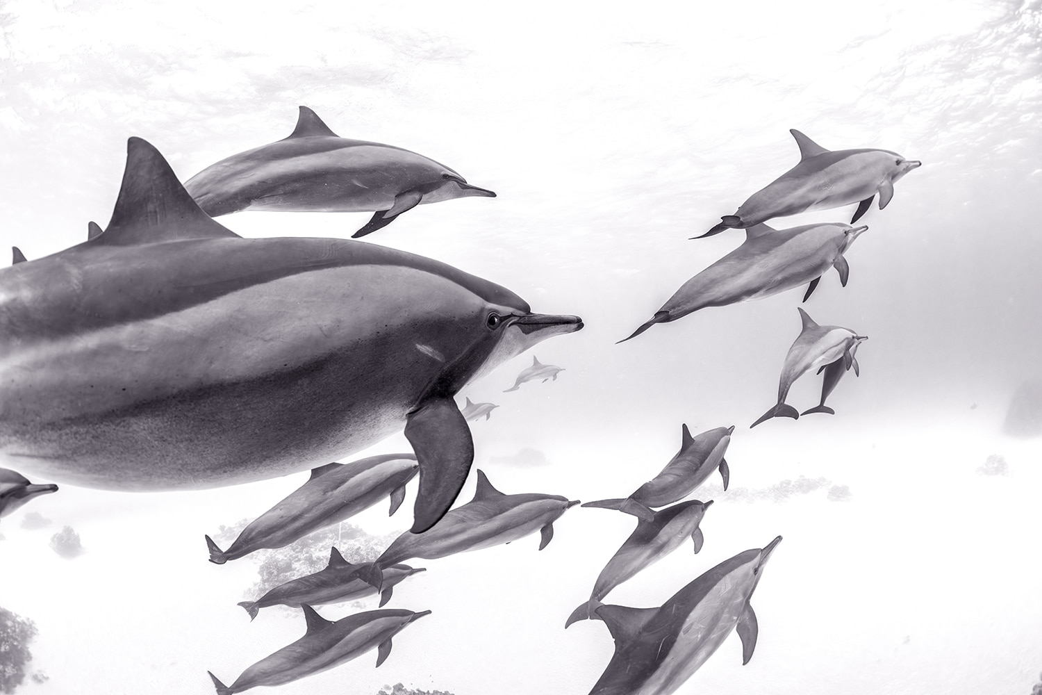 Inner Circle – This black and white fine art photograph captures a pod of spinner dolphins gliding effortlessly through the clear waters of the Red Sea. The monochrome tones emphasise their elegant forms and the quiet harmony of the group as they move together in the open ocean. Light filters softly from above, creating a timeless underwater scene that feels both peaceful and powerful. A striking piece of marine life art and ocean photography, perfect for refined coastal decor or collectors drawn to seascape art with depth and movement.