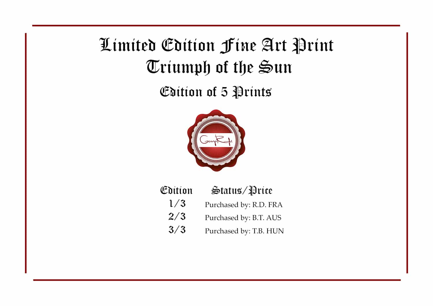 The 100 cm or larger artworks receive a numbered certificate displaying the printed image.